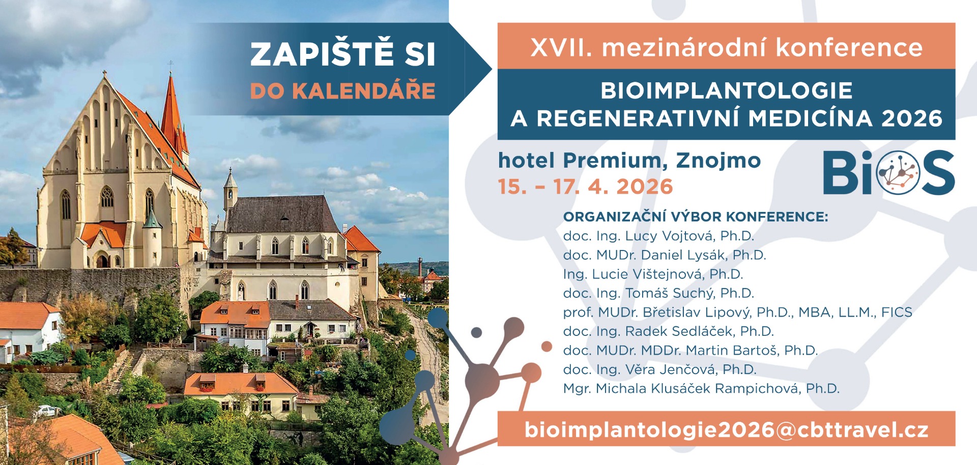 jménem Programového výboru konference a Společnosti pro bioimplantologii ČLS JEP bychom Vás rádi srdečně pozvali na XVII. mezinárodní konferenci Bioimplantologie a regenerativní medicína, která se bude konat ve dnech 15. - 17. dubna 2026 v krásném údolí řeky Dyje ve Znojmě v hotelu Premium.